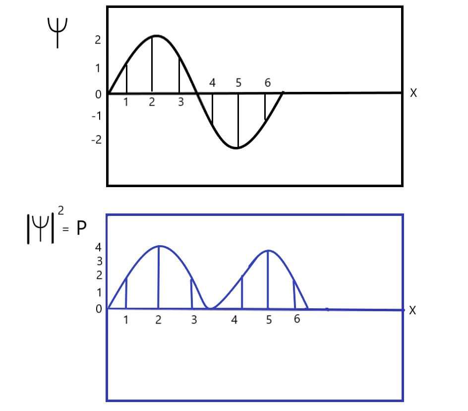 এখন, আমরা জানি না, কণাটা ঠিক কোন জায়গায় আছে। কোন একটা পয়েন্টে তার থাকার সম্ভাব্যতা হলো ওই পয়েন্টে তার বিস্তারের বর্গের সমানুপাতিক। নিচের ছবিতে এই জিনিস দেখা যাচ্ছে।